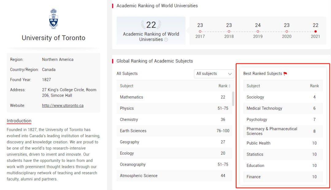 2021年,上海排名将多伦多大学在世界大学学术排名中排在第21位,以压倒性优势击败UBC和麦吉尔大学。