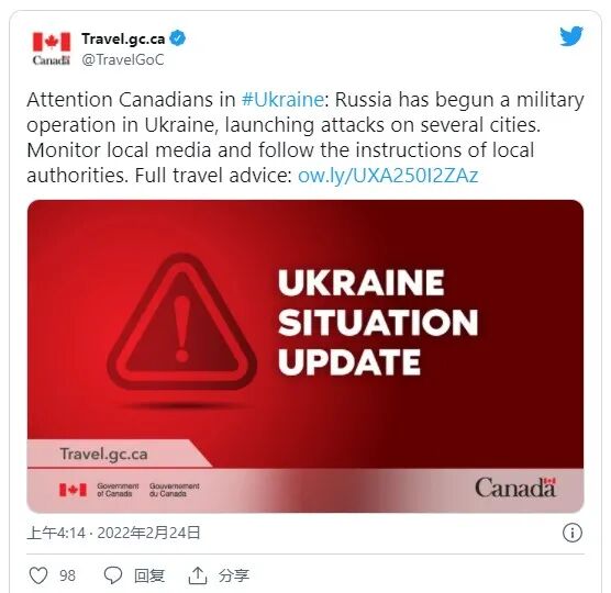 在俄罗斯对乌克兰发动军事袭击后,加拿大政府紧急发出“旅行禁令”,并向目前在乌克兰的加拿大人提供了建议。建议他们要么就地避难,要么在安全和可能的情况下尽快离开该国。