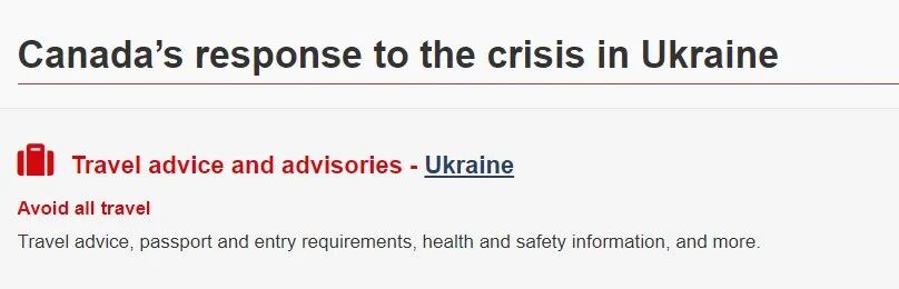 周四凌晨,加拿大政府更新了对乌克兰的旅行建议,上面写着:“由于俄罗斯发动武装冲突,避免前往乌克兰。”
