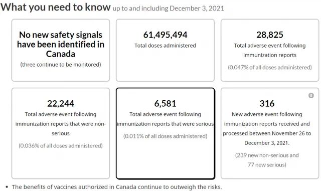 截至12月3日,加拿大已有28825例COVID-19疫苗免疫后的不良反应报告,占所有接种剂量的0.047%。其中有6581例不良反应是严重的,占所有接种剂量的0.011%。