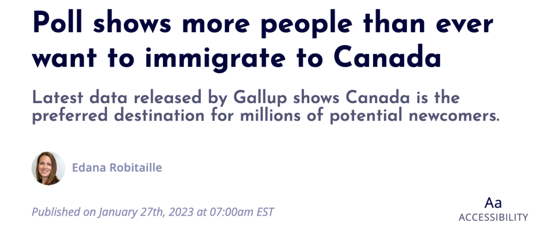 全球分析和咨询公司盖洛普最近的一项民意调查中,加拿大首次成为继美国之后最受潜在新移民欢迎的第二大目的地。