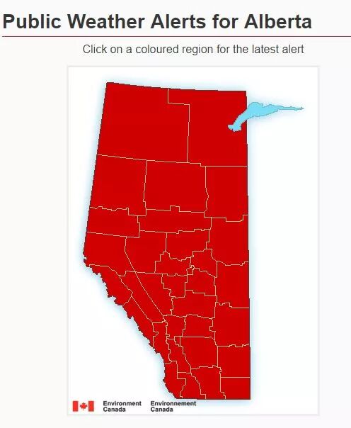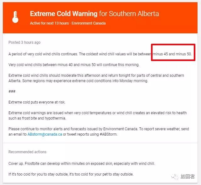 加拿大环境部已经对整个阿尔伯塔省发出红色极寒警告。