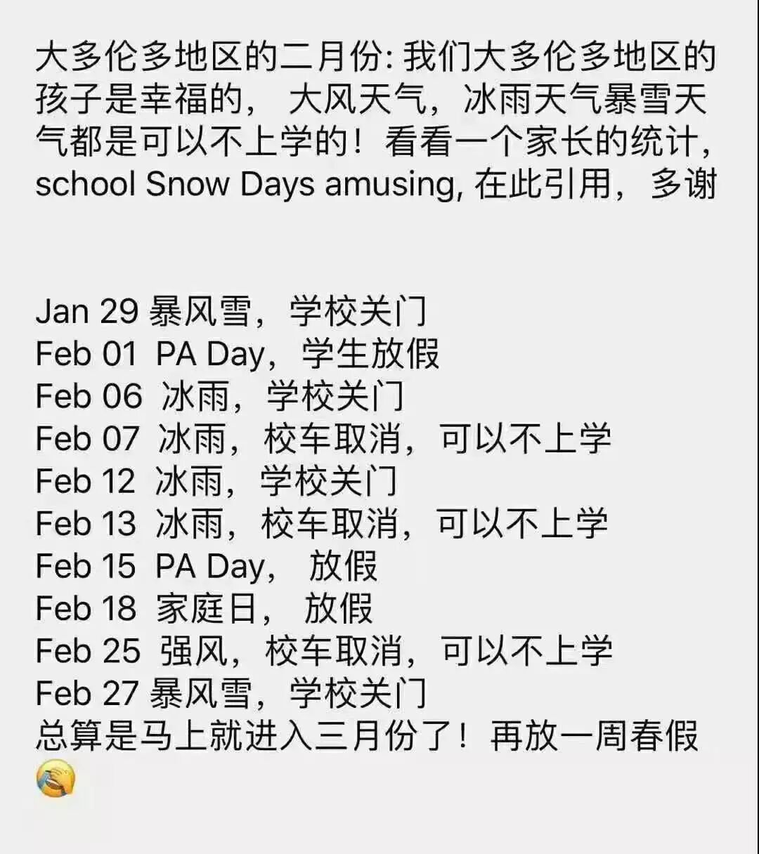 多伦多的二月份呢,记录也是破了无数个,看看多伦多华人家长的统计数据: